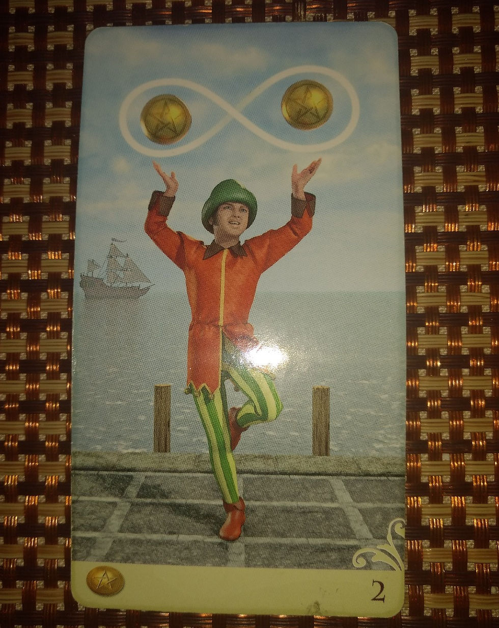 The two of Pentacles suggests that today may seem like a balancing act, but if we keep a good sense of humor, we can handle it with grace. The key is not to bite off more than we can chew. New opportunities are on the horizon!